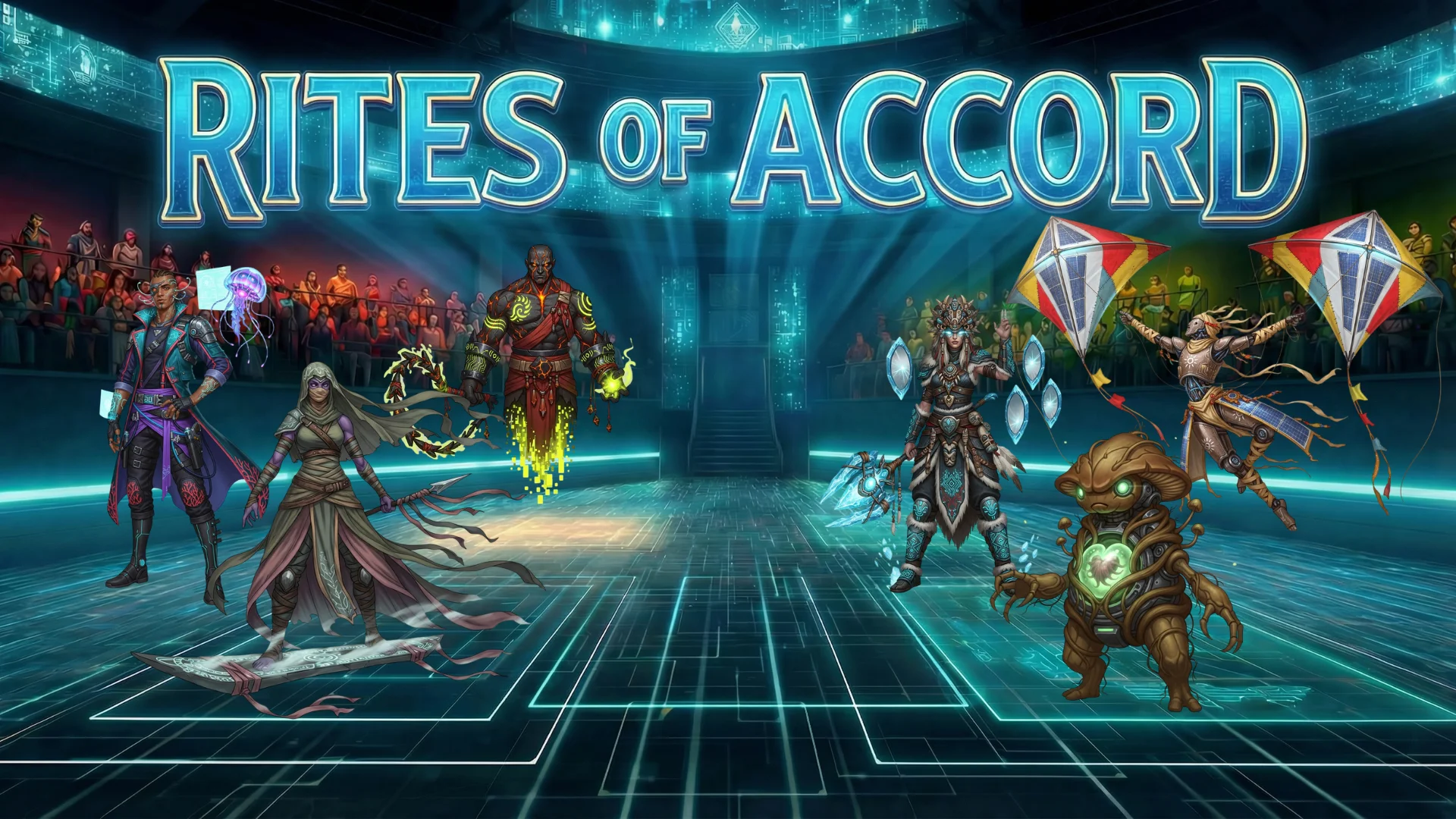 Welcome to Rites of Accord: a multiplayer turn-based and hex-based tactics game set in a future Earth where techno-tribes resolve their conflicts through ceremonial digital battles instead of warfare. Players bring pre-built armies into open-information matches focused on positioning, resource flow, and objective control.